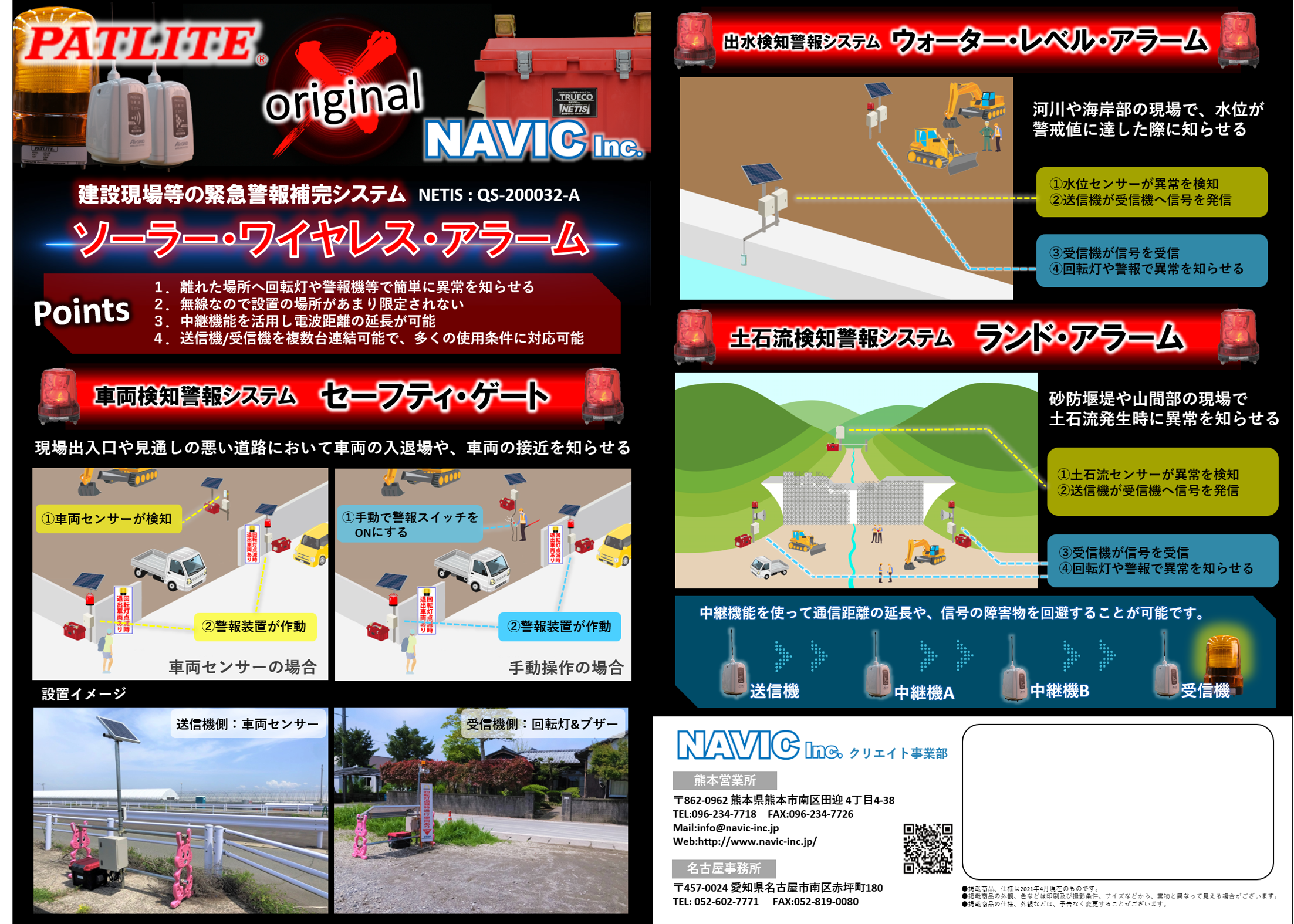 車両センサーを組み合わせて現場出入口の車両入退場の際の安全性向上、水位センサーを組み合わせて河川や海岸部の現場での水位管理や出水対策、土石流センサーを組み合わせて山間部の現場で土石流等の土砂災害検知など、送信機側に組み合わせるセンサーによって、様々な現場での緊急警報に応用することが可能な無線システムです。